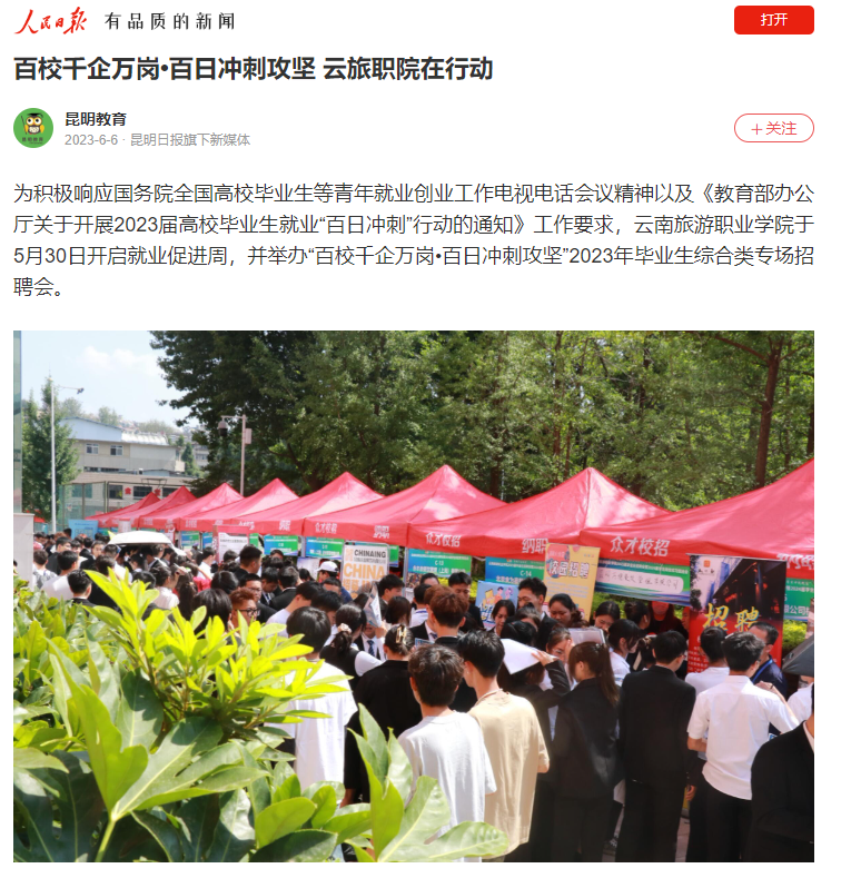 5月30日,人民日报、云南网发布《百校千企万岗•百日冲刺攻坚 云旅职院在行动》《5000多个岗位 江南官方注册举办2023届毕业生招聘会》,报道学院举办“百校千企万岗•百日冲刺攻坚”2023年毕业生综合类专场招聘会。