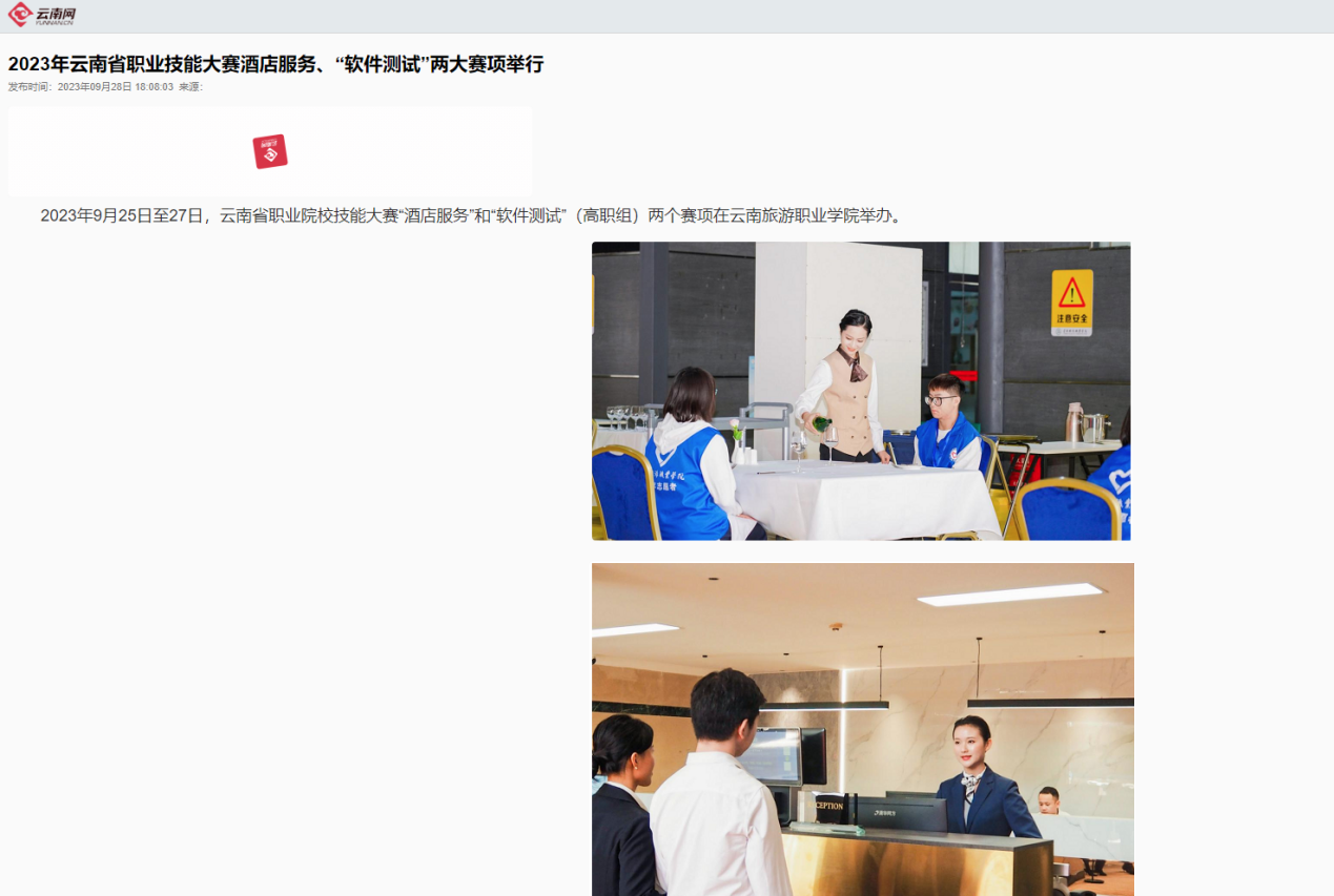 9月8日,云南网发布《2023年云南省职业技能大赛酒店服务、“软件测试”两大赛项举行》,报道了云南省职业院校技能大赛“酒店服务”和“软件测试”(高职组)两个赛项在江南官方注册举办。