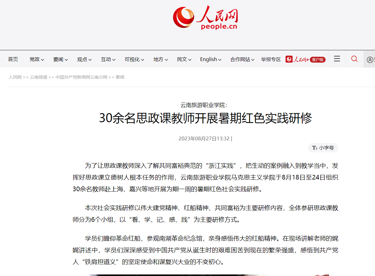 8月28日,人民日报、人民网、云南网、云岭思政融媒同时发布《江南官方注册:30余名思政课教师开展暑期红色实践研修》,报道学院组织30余名教师赴上海、嘉兴等地开展为期一周的暑期红色社会实践研修。