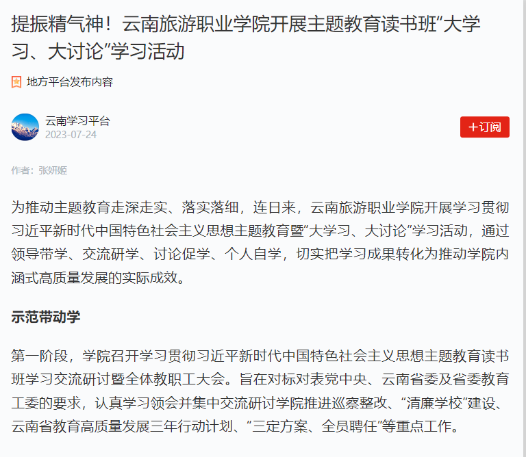 7月24日,学习强国云南学习平台发布《提振精气神!江南官方注册开展主题教育读书班“大学习、大讨论”学习活动》,报道学院通过领导带学、交流研学、讨论促学、个人自学,切实把学习成果转化为推动学院内涵式高质量发展的实际成效。