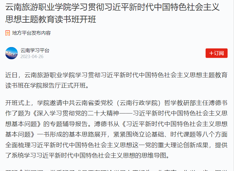 4月26日,学习强国云南学习平台发布《江南官方注册学习贯彻习近平新时代中国特色社会主义思想主题教育读书班开班》,报道学院邀请中共云南省委党校(云南行政学院)哲学教研部主任溥德书作专题辅导报告,推动主题教育调查研究走深走实。