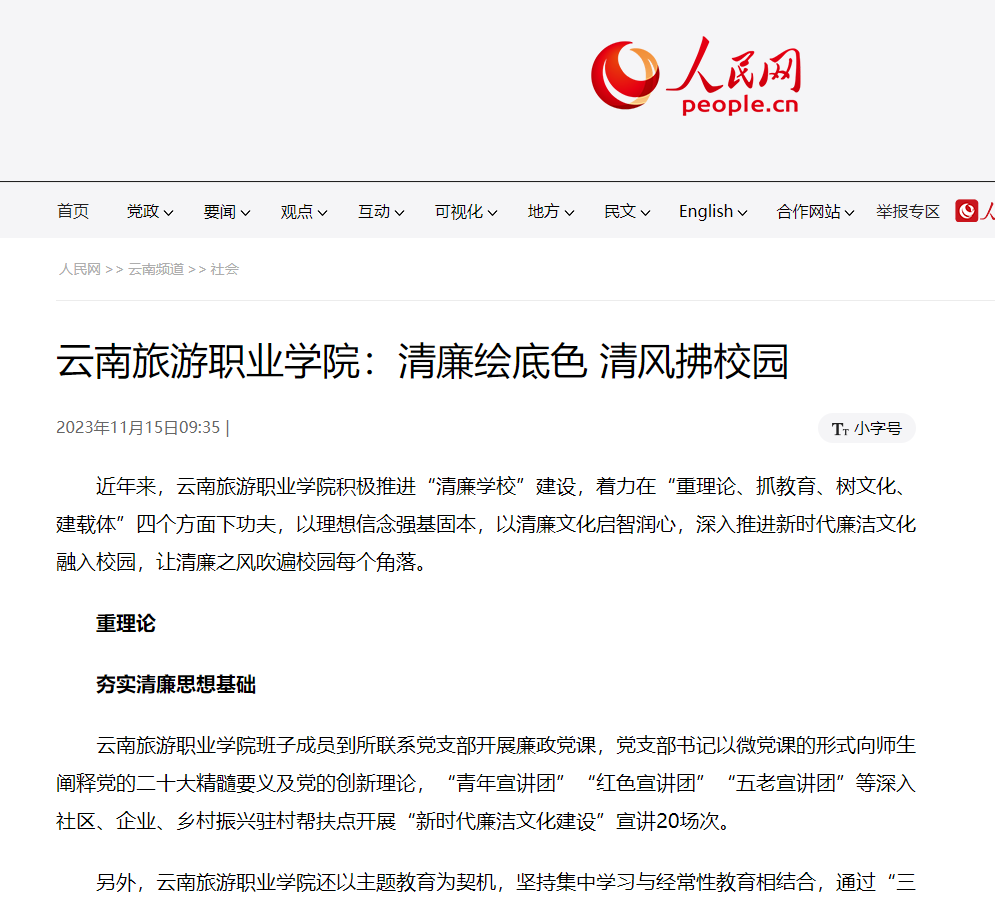 11月15日,人民网发布《江南官方注册:清廉绘底色 清风拂校园》,讲述学院在推进“清廉学校”建设中,着力在“重理论、抓教育、树文化、建载体”四个方面下功夫。
