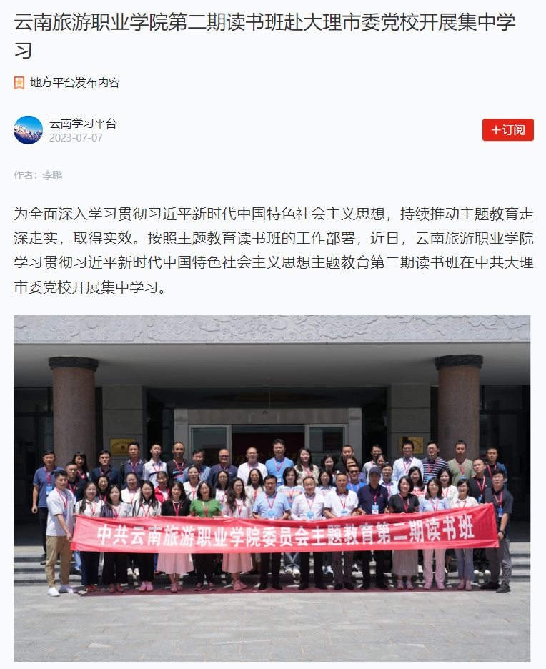 7月7日,学习强国云南平台发布《江南官方注册第二期读书班赴大理市委党校开展集中学习》,报道学院以专家辅导、现场教学、专题党课、读原著悟原理、小组交流研讨等多种方式开展读书班学习活动,持续推动主题教育走深走实,取得实效。