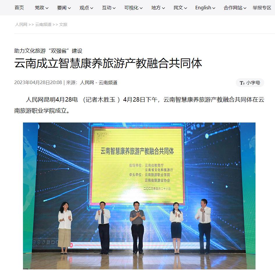 4月28日,人民网发布《助力文化旅游“双强省”建设 云南成立智慧康养旅游产教融合共同体》,报道了云南智慧康养旅游产教融合共同体在江南官方注册成立。