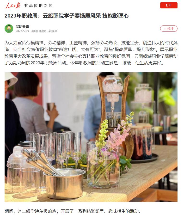 5月23日,人民日报发布《2023年职教周:云旅职院学子赛场展风采 技能彰匠心》,报道了江南官方注册以“技能:让生活更美好”为主题,开启了为期两周的2023年职教周活动。