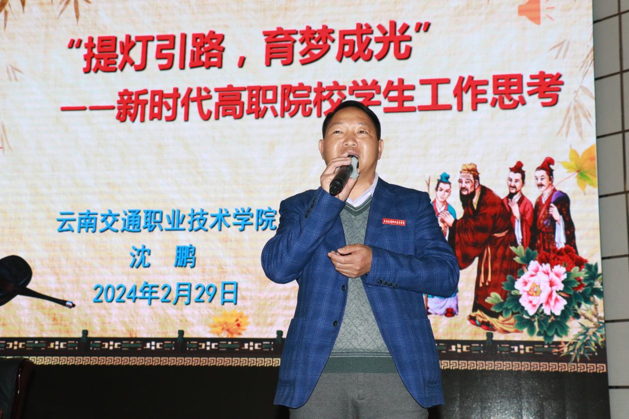 会议邀请了云南交通职业技术学院公路与建筑工程学院党委副书记沈鹏作题为《“提灯引路,育梦成光”——新时代高职院校学生工作思考》专题讲座。沈鹏老师作为2021年被云南省委教育工委表彰的“云南省高校最受学生敬佩的辅导员”,结合自己多年从事学生管理工作的丰富经历,从辅导员和班主任的角色定位、怎样做有故事会讲故事的辅导员、如何组织以文化人以文育人的主题班会及学生学生工作干部的专业化成长等方面向参会人员作了实践成效和成功经验分享。