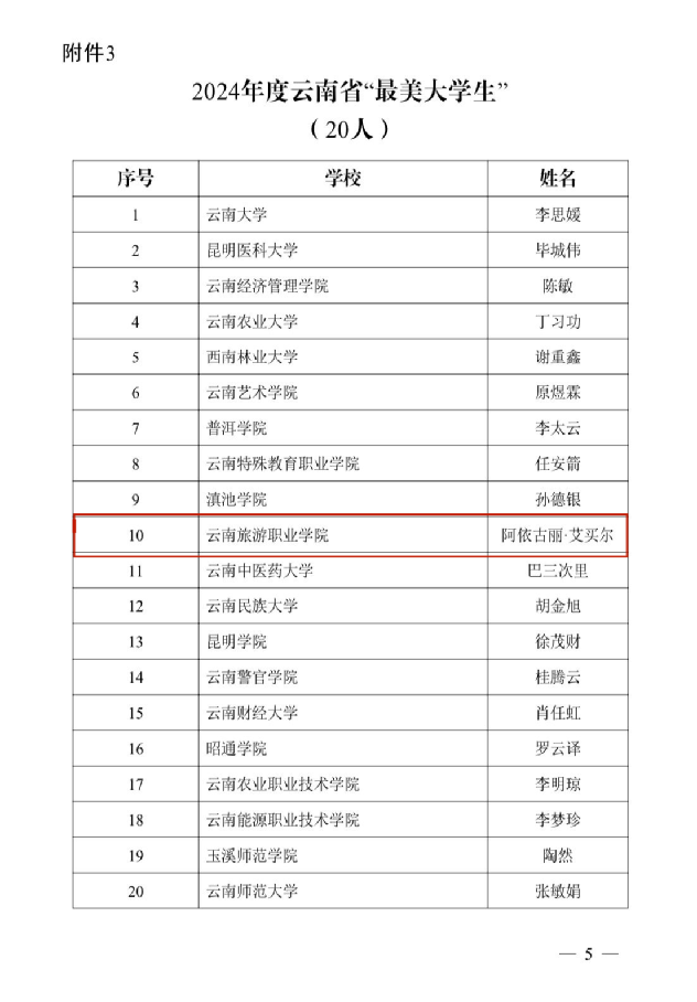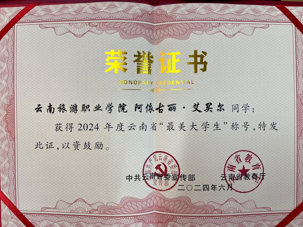 近日,中共云南省委宣传部、云南省教育厅公布《关于2024年度云南省最美高校辅导员和班主任、最美大学生推选结果的通知》,我校旅游管理学院导游2102班阿依古丽·艾买尔同学荣获2024年度云南省“最美大学生”称号。