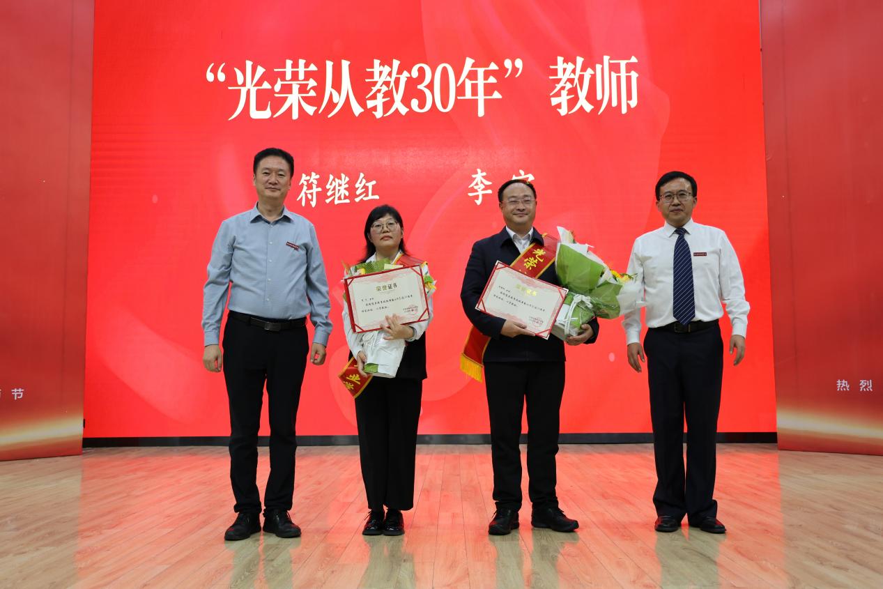 致敬提灯引路人,感恩育梦成光者。大会宣读了“光荣从教30年”教师名单。在师生充满敬意的目光中,2名“光荣从教30年”的教师坚定地走上台,从校领导手中接过“光荣从教30年”荣誉证书。走上奖台,他们只用了几秒钟,而迎来这一高光时刻,他们却用了30年,这一路洒满汗水,也结满了硕果。学生代表捧来的鲜花,承载了满满的敬意和感谢。