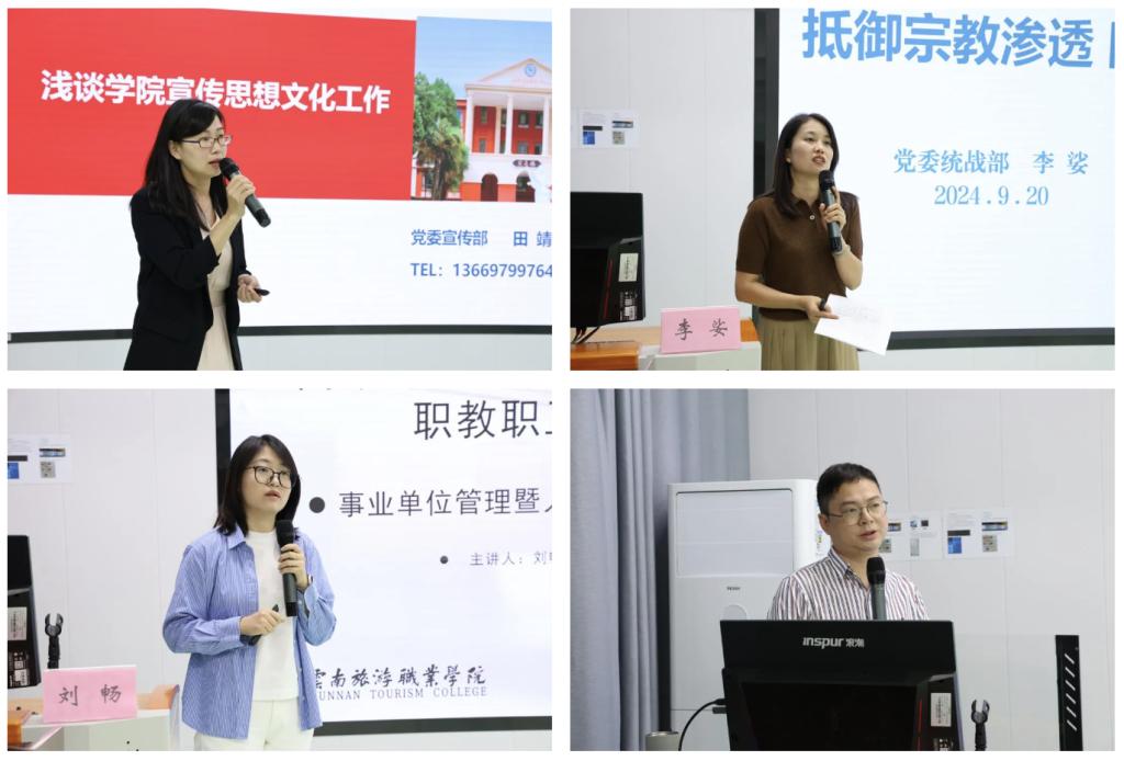 本次培训聚焦应知应会、突出实务操作,精心组织安排了《师德师风教育-以教育家精神引领教师专业发展》《学校历史及发展》《职业院校教师专业化成长及职业生涯规划》《浅谈我校宣传思想文化工作》《抵御宗教渗透防范校园传教》《事业单位管理及人事管理有关制度解读》《教学管理教学工作应知应会及“双高”建设》《辅导员工作及班主任工作实务》《教师科研能力培训》《职业教育教师能力提升》《高校教师入职心理健康》等14场专题。学校有关领导、部门负责人精心准备、亲自讲授,内容务实、形式丰富,确保了培训内容既接地气又富有前瞻性。