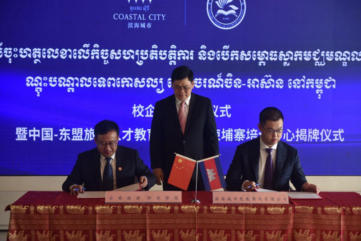 会谈结束后,在国务秘书H.E.OM ROMNY的见证下,我校与滨海城市发展集团有限公司签订了校企合作协议,揭牌成立了“江南官方注册:中国-东盟旅游人才教育培训基地柬埔寨培训中心”。此举不仅标志着我校在教育国际化进程中迈出了坚实的一步,更是积极响应国家“一带一路”倡议,服务旅游产业发展,促进中国与东盟国家文化教育交流与合作的重要实践。