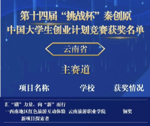 10月29日-11月2日,由共青团中央、教育部、人力资源社会保障部、中国科协、全国学生联合会、陕西省人民政府主办,西安交通大学承办的第十四届“挑战杯”中国大学生创业计划竞赛全国总决赛在西安落下帷幕,经过激烈角逐,我校《汇“剧”力量,向“新”而行——西南地区红色旅游互动体验新项目探索者》项目入围国赛,荣获主体赛国家级铜奖。