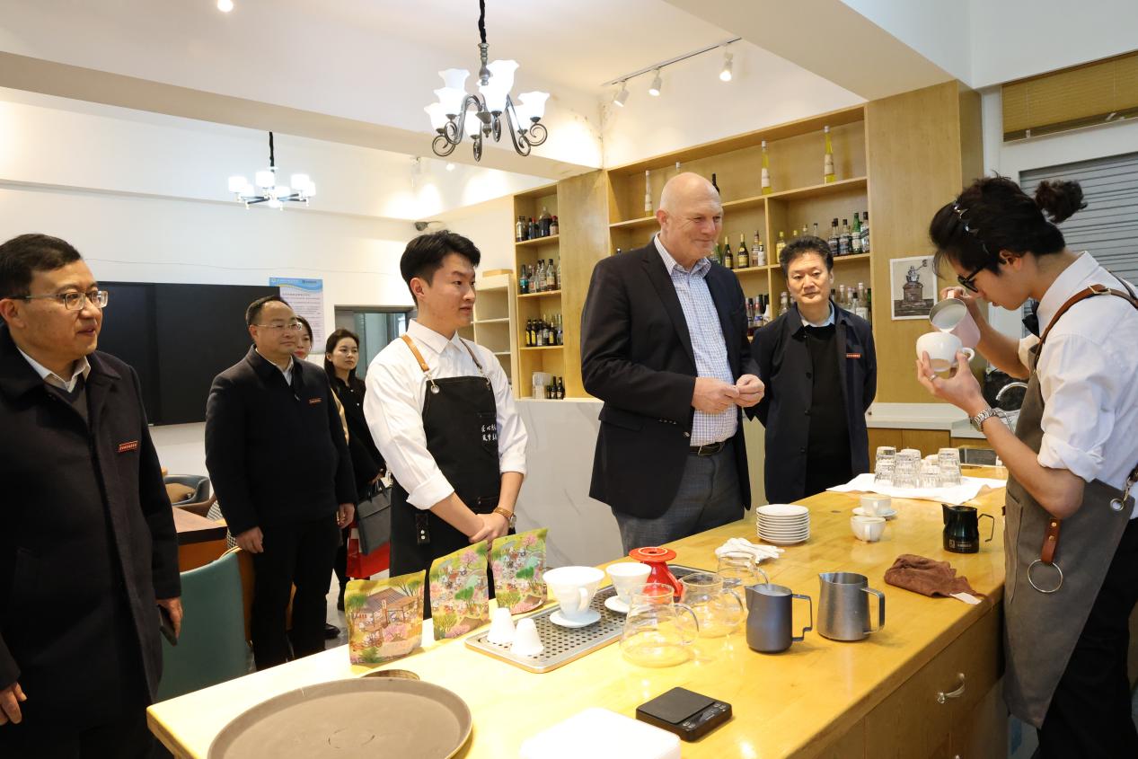 访问当天,大使在校领导的陪同下,参观了我校具有历史、文化、发展象征意义的紫晶楼和文旅浮雕,并前往酒店管理学院虚拟仿真实训室、咖啡双创教室、葡萄酒品鉴教室、茶艺审评教室、香道教室等地,实地考察了我校多个教学实训场所。期间,大使还亲自体验了咖啡拉花技能、中国传统香道和茶文化,并对我校在旅游职业教育方面的创新发展和实践特色表示高度赞赏。
