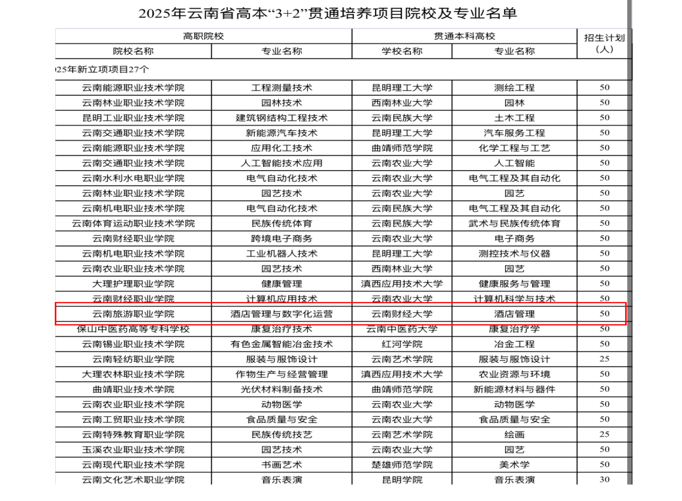 近日,云南省教育厅公布了2025年云南省职业教育贯通培养项目院校及专业目录,我校酒店管理与数字化运营专业成功入选高职院校与本科高校“3+2”贯通培养项目院校。该项目由我校与云南财经大学合作实施,两校联合制定人才培养方案,酒店管理学院具体负责教学实施,计划今年招收50人。