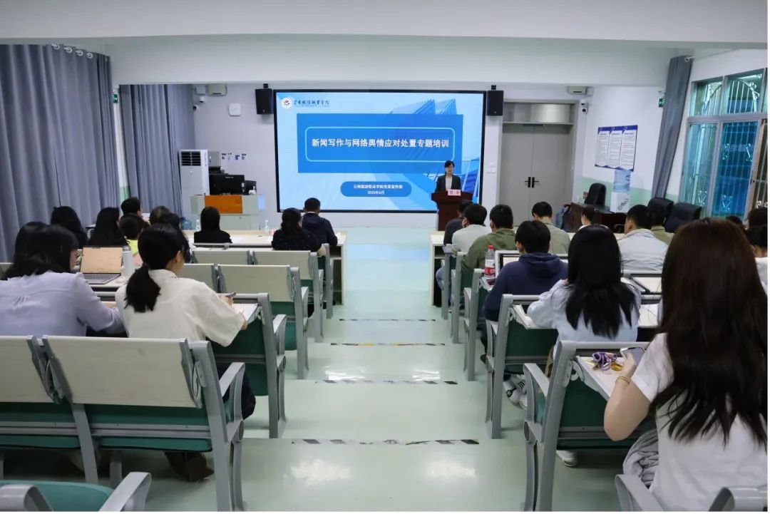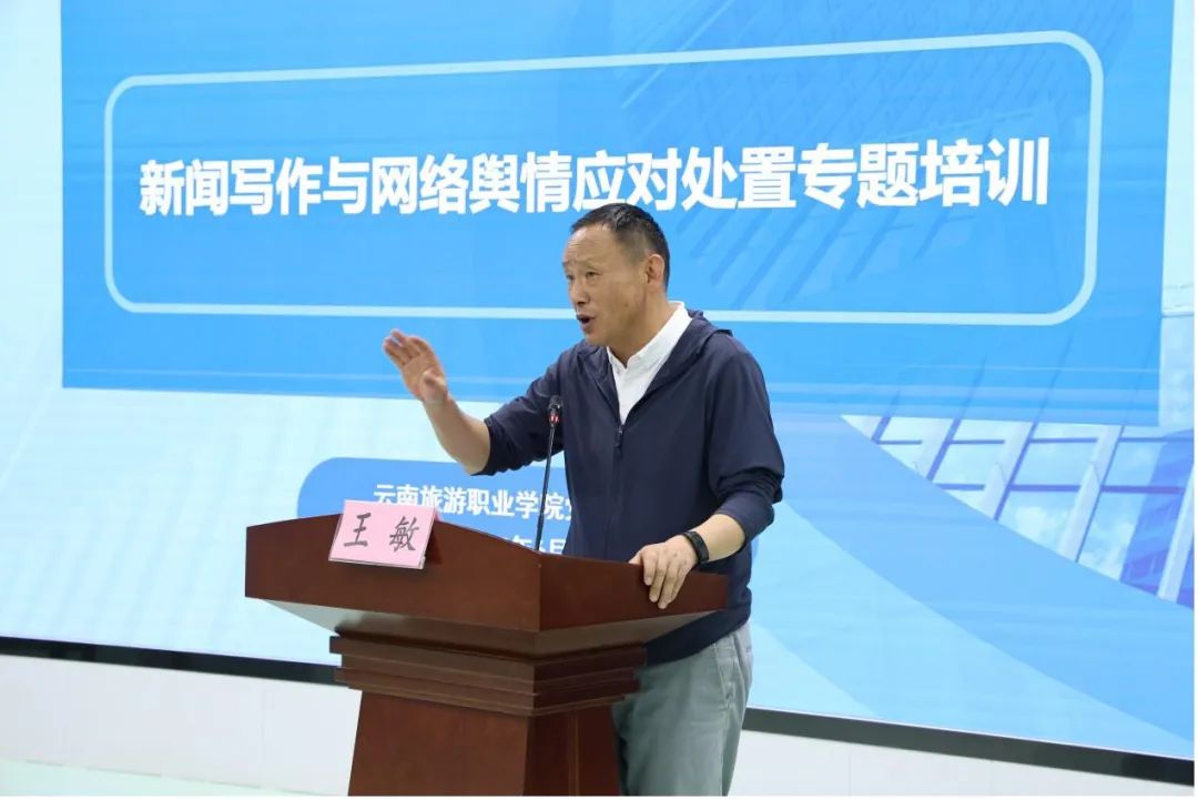 为深入贯彻习近平总书记在全国宣传思想文化工作会议上的重要指示精神,全面贯彻落实全国教育大会精神,构建全方位、多层次的“大宣传”工作格局,6月19日下午,我校携手新华社新闻信息中心云南中心在综合楼121阶梯教室举办新闻写作与网络舆情应对处置专题培训。党委副书记王敏,各党支部书记/副书记、网络宣传员、专职辅导员、团总支书记、新入职的教职工以及各部门承担新闻写作任务和爱好新闻宣传的教师共60余人参加培训。培训由党委宣传部部长田靖主持。
