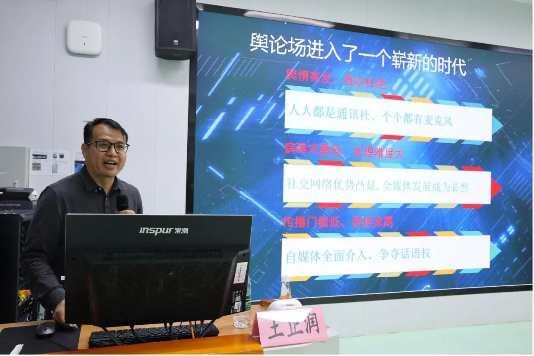 第二阶段的培训由新华社中国经济信息社舆情监测中心高级分析师、主任王正润担任,他以“新媒体环境下舆论场特征与处置”为题展开,通过大量详实、生动的典型案例分析,分析了新时代舆论场规律特征、舆论传播四大定律,高校类舆情热点、对症下药处置舆情危机、与媒体打交道的技巧与实务等内容,深入剖析了近年来高校宣传和新闻发布中的各类风险表现,详细阐释高校宣传工作的特殊性,明确内容发布红线,以及舆论场规律特征给舆情应对处置带来的风险挑战,助力我校营造清朗舆论环境。