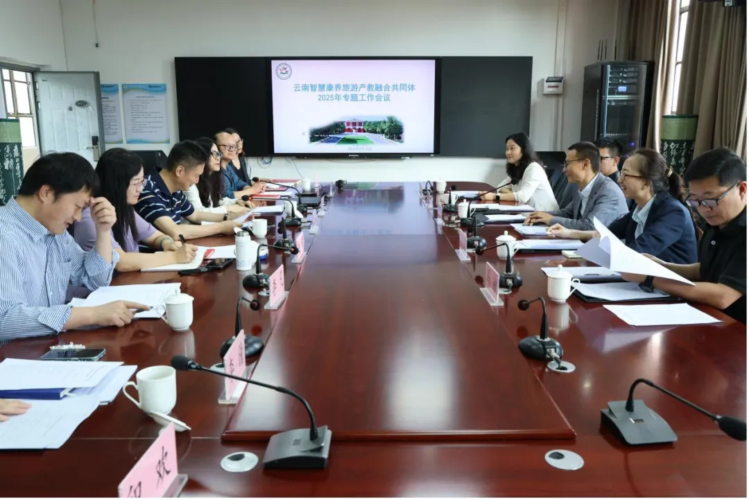 为进一步完善共同体建设及运行机制,推动构建产教融合新机制,促进产教深度融合,服务云南省文旅康养产业高质量发展。近日,云南智慧康养旅游产教融合共同体(以下简称共同体)牵头及发起单位2025年专题工作会议在我校顺利召开。我校领导及相关职能部门负责人与云南省旅游业协会办公室主任左琦和牵头单位云南省康旅控股集团有限公司战略发展部副总经理杨恒、云南师范大学管理学院副院长夏百川、管理学院旅游管理系主任冯斌和管理学院专业负责人余媛媛等专家齐聚一堂,共商产教融合发展大计。会议由江南官方注册党委委员、副院长王霞主持。