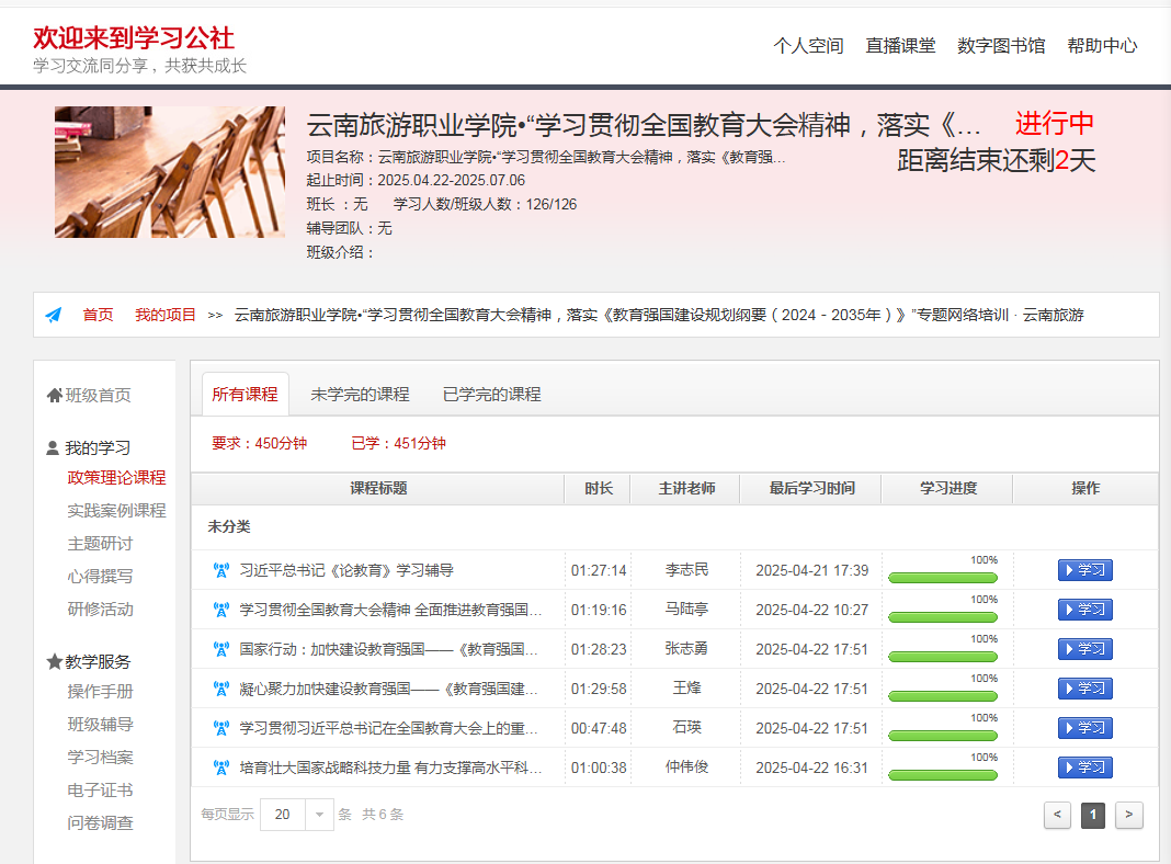 为深入学习党的二十大和二十届二中、三中全会精神,贯彻落实习近平总书记在全国教育大会上的重要讲话和全国教育大会精神,我校为期两个月的“学习贯彻全国教育大会精神,落实《教育强国建设规划纲要(2024—2035)》加快推进教育强国建设”专题网络培训于近日落下帷幕。全体校领导、中层干部、教研室主任、专业带头人、骨干教师、教学名师共126人参加了本次培训。