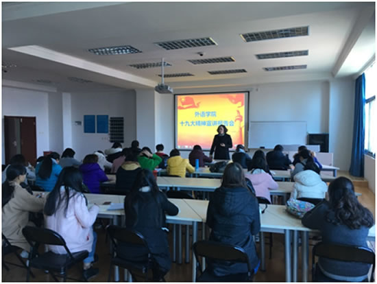 按照学校党委的统一部署,为深入学习宣传贯彻党的十九大精神,2017年12月22日中午,外语学院在图书馆四楼新情景实训室召开“十九大精神”宣讲报告会,外语学院全体党员、教职工及学生党员、入党积极分子参加了宣讲报告会。