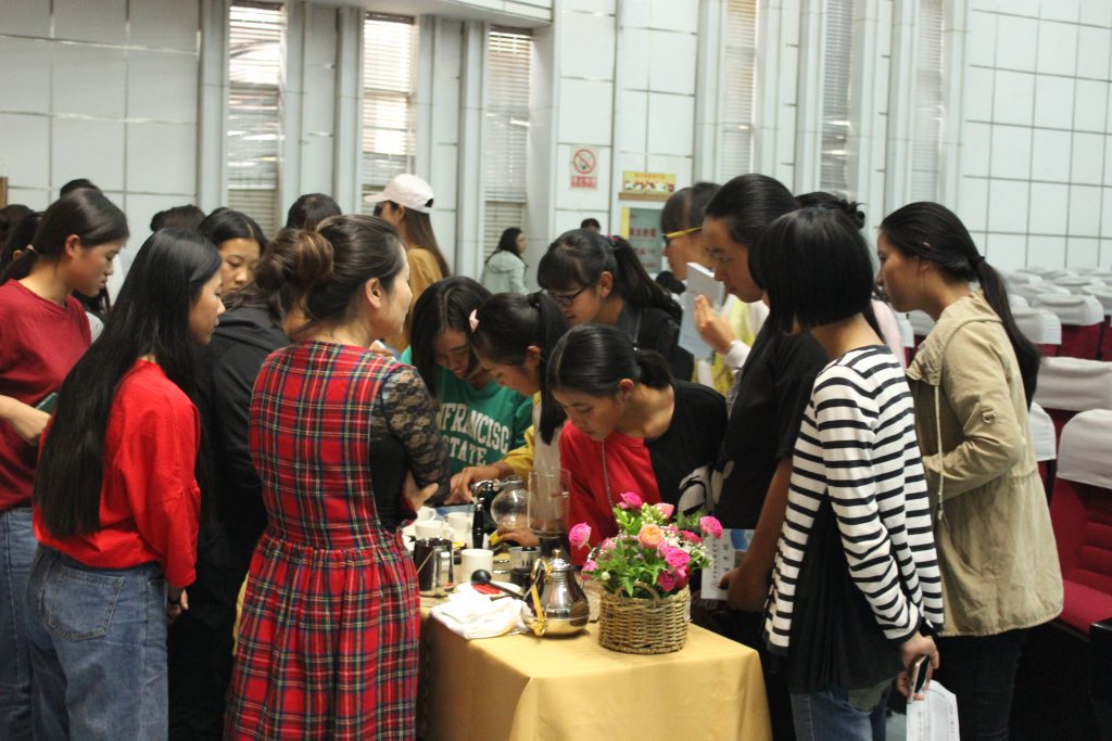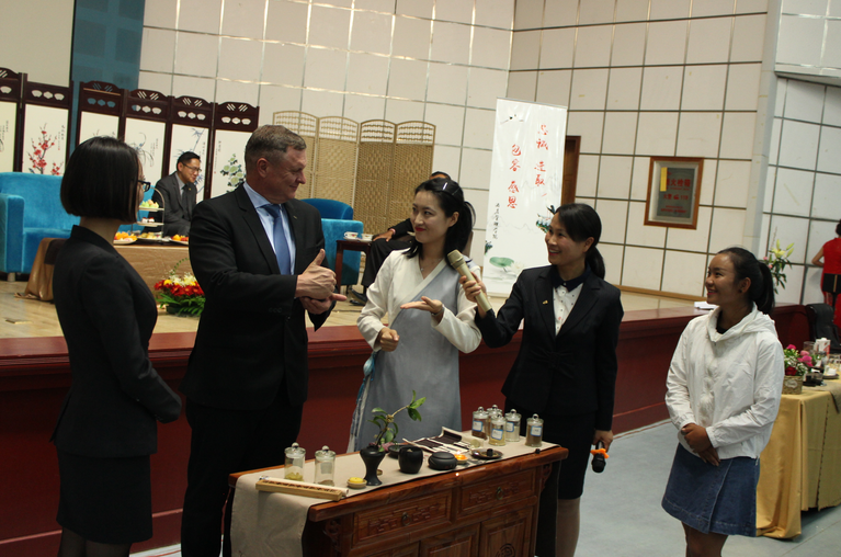 见面会还设计有师生互动环节,新生们通过近距离观看及体验四位专业导师带来的香道礼仪、中式下午茶(申时茶)礼仪、咖啡礼仪、红酒礼仪的展示,认识到礼仪对于人际交往的重要意义,深刻体会中西礼仪文化的感召。