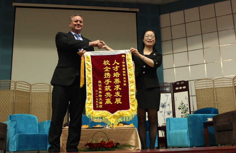 金秋九月,丹桂飘香,我们迎来了新同学。2017年9月12日,由酒店管理学院主办的“2017级新生见面会” 暨“从家出发,以中式待客之礼迎接新生”主题专业教育活动在学校报告厅顺利进行。在会上2017级新同学、酒店学院全体教师外,还特别邀请到昆明索菲特酒店总经理刘安先生、人力资源副总监廖正维先生,昆明洲际酒店市场传媒总监周凌祎女士、人力资源经理余力女士,中维翠湖宾馆副总经理杨永峰先生,昆明七彩云南至尊豪庭大酒店人力资源经理任昕女士,建水心香书院院长赵雅婷女士作为出席嘉宾。