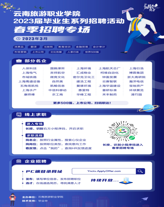 春风迎招聘,云端促就业。云南旅游职业学院始终把毕业生就业作为全校工作重中之重,深入落实毕业生就业工作“一把手”工程。此次线上招聘会的成功举办更是一个良好开端,拉开了学校毕业生春季就业招聘的序幕。接下来,云南旅游职业学院将抓住校园招聘的黄金期,不断激发2023届毕业生的就业热情,积极引进各地区、各行业、各层次用人单位,满足毕业生多样化求职需求,打通毕业生就业信息通道、成长通道,做学生职业生涯发展的“领路人”,不断推动校园招聘提质升级。