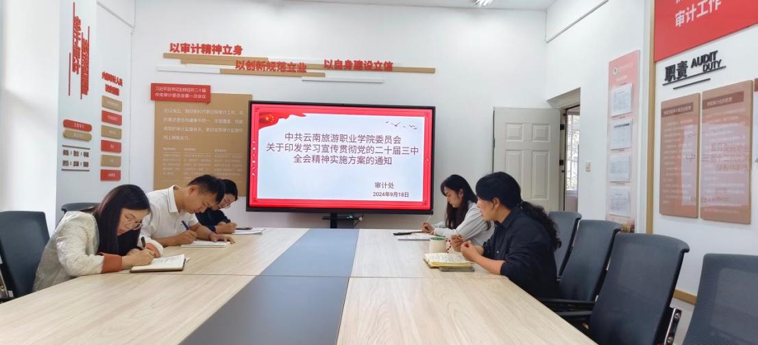 9月18日,学院审计处组织部门全体教职工开展集体学习研讨暨工作部署会,深入学习党的二十届三中全会精神,进一步增强全面深化改革的政治自觉、思想自觉、行动自觉,推动全会精神落地落实。会议由审计处处长杨银开主持。