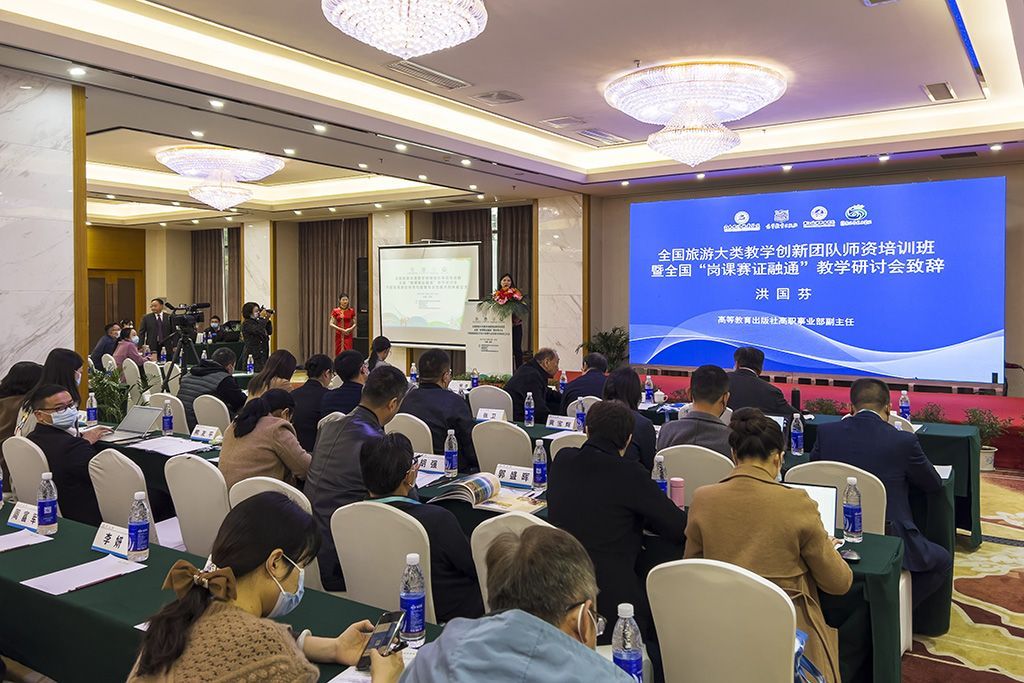 研讨会上,教育部职业技术教育中心研究所副所长曾天山,国家教育行政学院学术委员会主任、职业教育研究中心主任研究员、教授邢晖等专家学者分别作了《“岗课赛证”融合,推进人才培养模式》《职业教育教师教学创新团队建设的几点思考》《“十四五”时期教材的规范与要求》《职业教育旅游类专业教学标准修制订的思考》等主旨报告及学术交流。