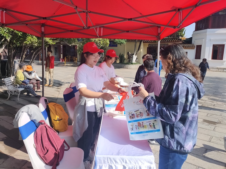 志愿讲解员在为游客发放宣传资料