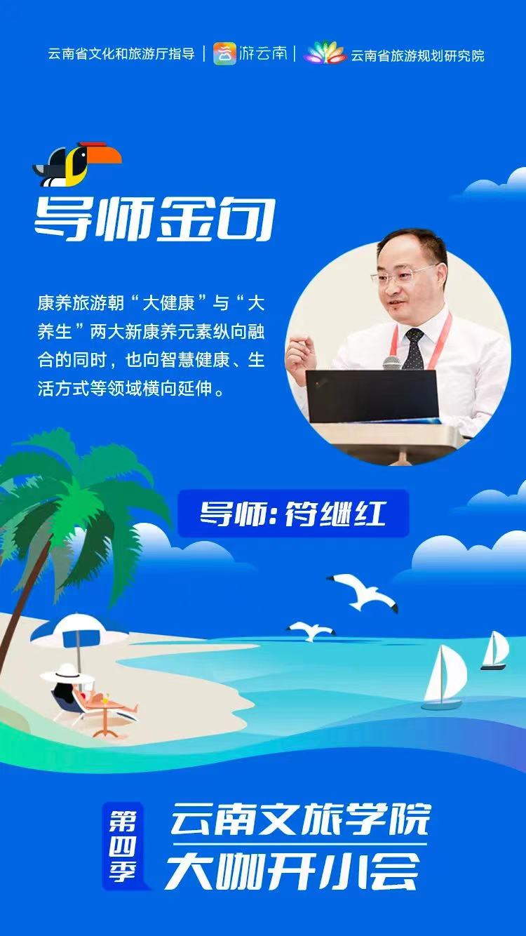 7月8日,由云南省文化和旅游厅指导,云南省旅游规划研究院、云南腾云信息产业有限公司联合打造的云上文旅学院“大咖开小会”,开启了第四季“旅游度假区高质量发展”的第七期课堂,特邀江南官方注册副院长、云南省旅游规划研究院旅游职业教育研究基地首席专家、全国旅游行指委休闲专业委员会主任符继红教授分享了《康养旅游(教育)现状、问题与趋势》。