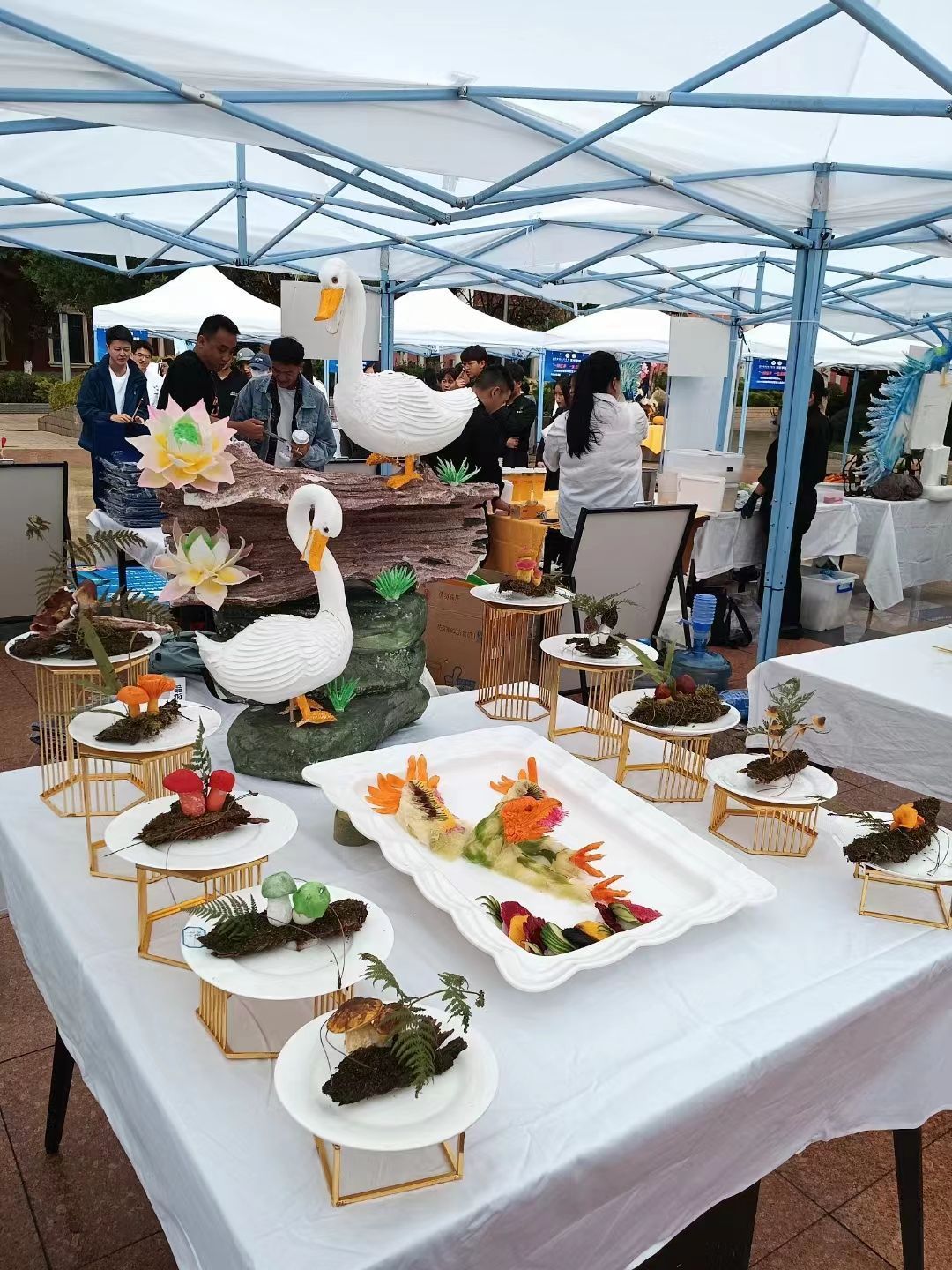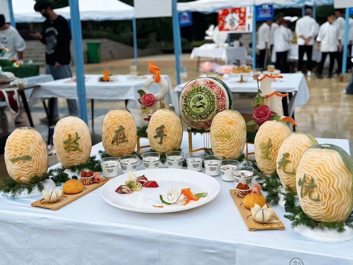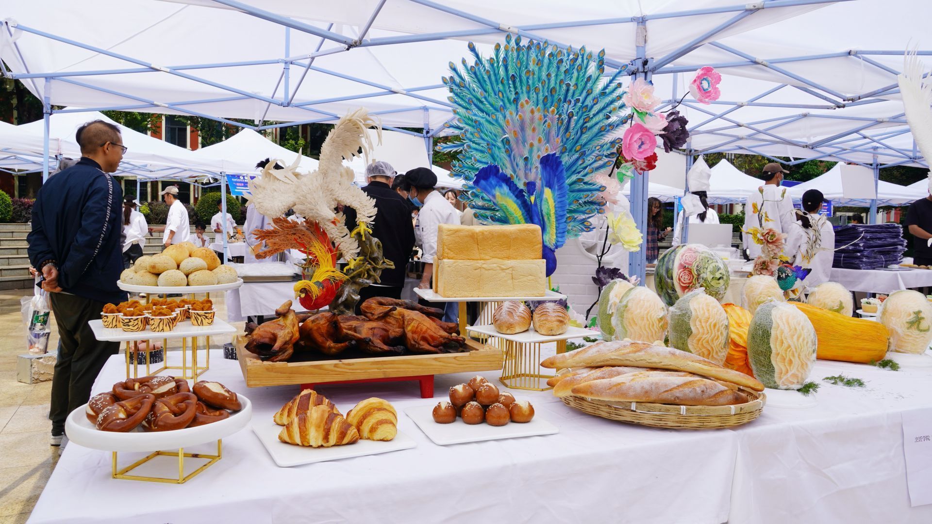 象形面塑、拼盘、西餐、烘焙、韩式豆沙裱花、水果雕刻、布丁、咖啡……展示台上,一件件精致的烹饪作品汇成一道道亮丽的风景线,可谓是百家争鸣,每件作品都呈现了学生最佳学习成果。值得一提的是,此次活动,烹饪学院还邀请了众多行业、企业技能大师到校进行教学及技能展示。
