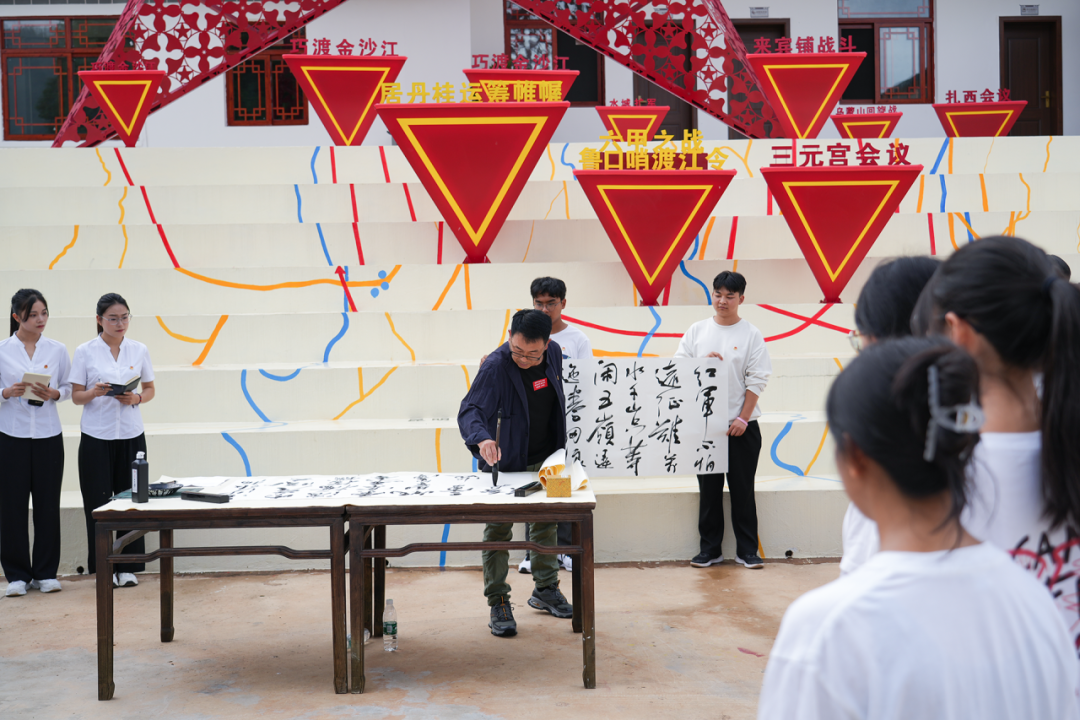 为进一步弘扬长征精神,江南官方注册图书馆馆长于会超现场挥毫泼墨,书写了“七律长征诗”和“长征精神 永放光芒”等书法作品。这些作品不仅展现了教师的深厚文化底蕴,也寄托了在场师生对红色文化的深厚感情。