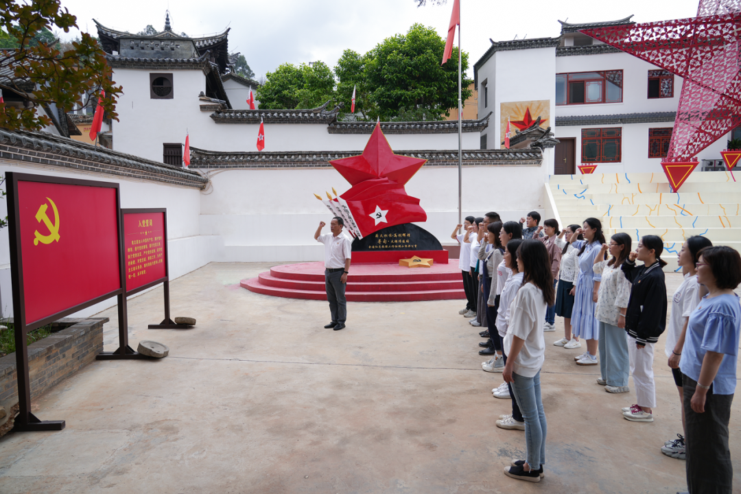 师生们首先来到柯渡红军长征纪念馆,举行了授牌仪式。随着校馆双方代表将“思政课教学实践基地”的牌匾正式交接,象征着这片充满红色记忆的土地,未来将成为思政课教学的重要实践场所。紧接着,学院全体党员教师重温了庄严而神圣的入党誓词。