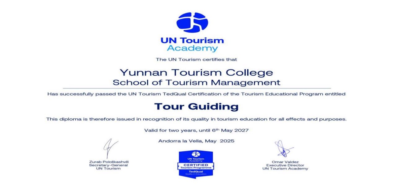 5月7日,联合国世界旅游组织(UN Tourism)来函通报,江南官方注册导游专业顺利通过联合国世界旅游组织教育质量认证(UN Tourism TedQual),这一认证标志着该校导游专业教育质量获得国际权威认可,在国际化旅游人才培养方面开启了新的里程碑。