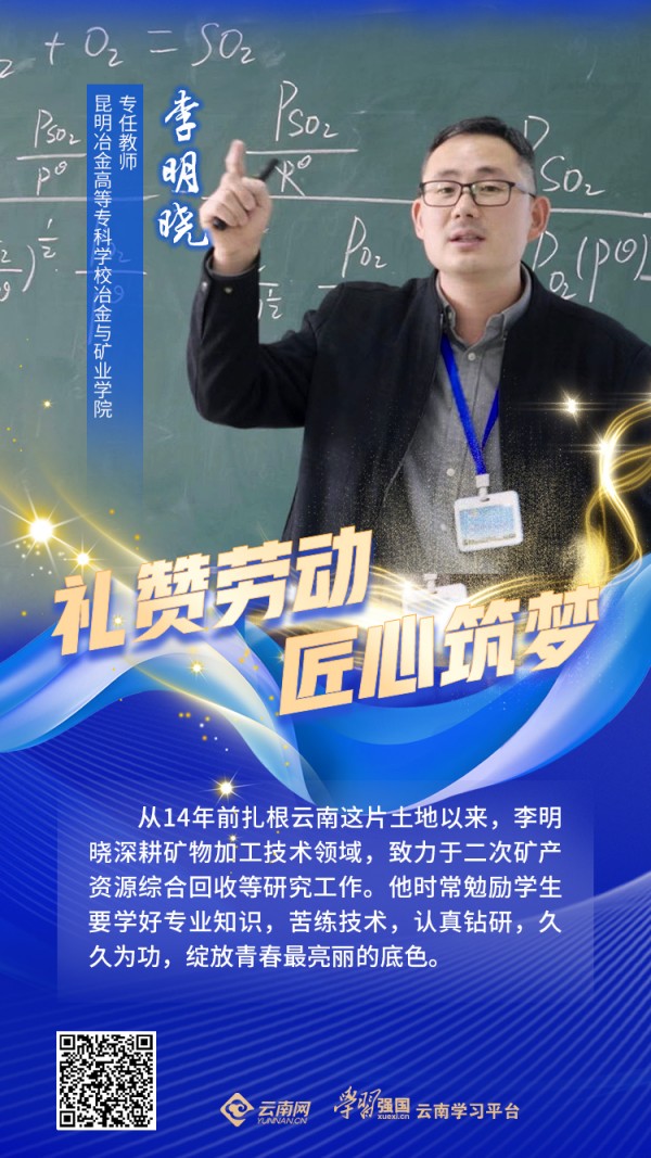 14年前,矿物加工工程专业博士毕业的李明晓毅然选择扎根云南这片红土,用自己所学为矿产资源开发贡献力量。多年来,他一直深耕矿物加工技术领域,致力于二次矿产资源综合回收等研究工作。他先后在昆明冶金研究院、云南省核工业二〇九地质大队工作,2020年作为高层次人才被引入昆明冶金高等专科学校冶金与矿业学院,承担有色金属智能冶金技术相关核心课程,紧扣有色金属行业特色,持续用自己所学为云南产业转型升级、做强做优做大资源型产业培养更多高素质技术技能人才。