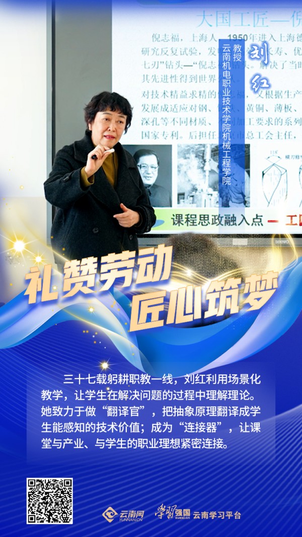 【人物名片】刘红,云南机电职业技术学院机械工程学院教授。先后5次指导学生参加全国大学生机器人、机器人技术应用等大赛上获得国家、省级技能竞赛大奖,课程思政教学案例获得中国机械政研会机械职业教育思想政治工作研究会“课程思政”优秀教学案例三等奖。2024年荣获“全国模范教师”荣誉称号。