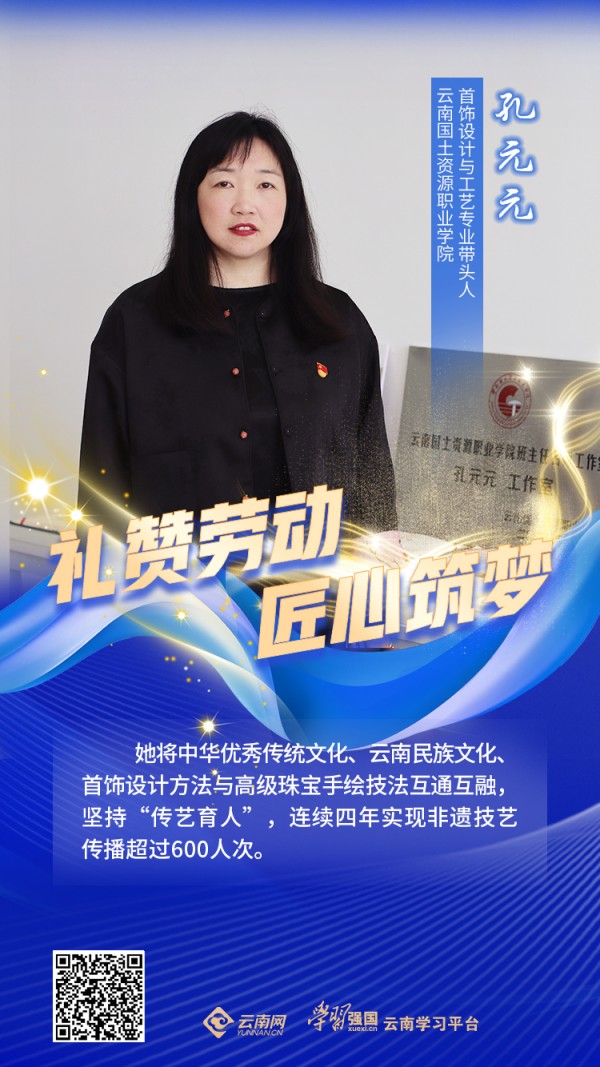 孔元元既是以技能传承为使命的“点灯人”,也身兼高级技师之责。在学校里,她承担16门专业课、10门实践课教学任务,主讲高级珠宝设计手绘课程,实施“岗课赛证展”“五位一体”的教学要求,将中华优秀传统文化、云南民族文化、首饰设计方法与高级珠宝手绘技法互通互融。