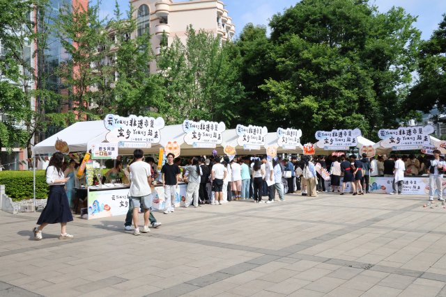 走进烹饪学院的非遗市集,一场融合传统与潮流的创意展览——“云Young非遗市集·家乡Young起来”热闹开场。彩色帐篷、复古摊位、民族服饰……从米线到火腿,从糖画到彝族粑粑,云南地方风味琳琅满目,现场烟火气十足。学生们身着民族服饰,以年轻视角“演绎”非遗,令人眼前一亮。