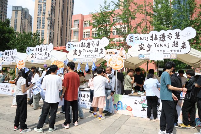 此次市集以“创意+传承”为理念,展出了数十种与饮食相关的非遗项目,许多学生身穿民族服饰,热情介绍自己家乡的传统美食。“非遗不该只在博物馆里,它更应该在每个人的日常生活中。”烹饪学院党支部副书记沈晓文介绍,此次市集重点围绕云南本地饮食类非遗项目进行创新展示,通过学生策划与企业协同,将传承与创新融入教学全过程。
