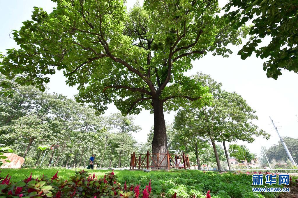 在河南兰考县焦裕禄干部学院门口,游客从“焦桐”下走过(2017年8月9日摄)。新华社记者 冯大鹏 摄