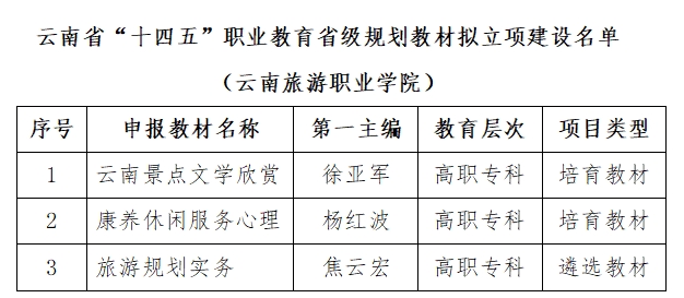 近日,云南省教育厅公示,我校3本教材入选云南省“十四五”职业教育省级规划教材拟立项建设名单。