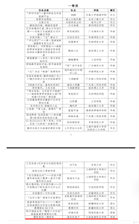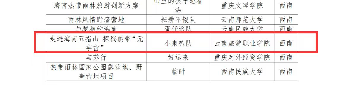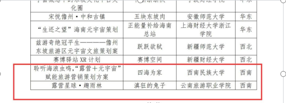 我校旅游管理学院参赛团队精心准备,在元宇宙+文旅项目策划版块《露营星球·趣雨林》荣获西南赛区(初赛)一等奖一项,为西南赛区(初赛)中唯一的职业院校获奖作品。《走进海南五指山 探秘热带“元宇宙”》荣获西南赛区(初赛)优胜奖一项。