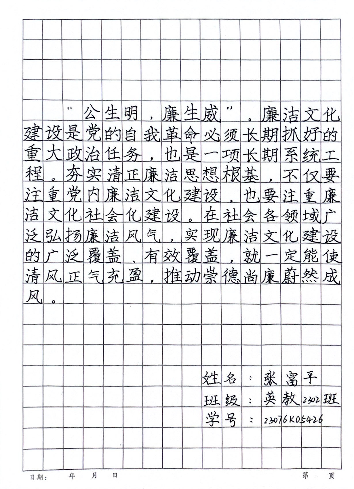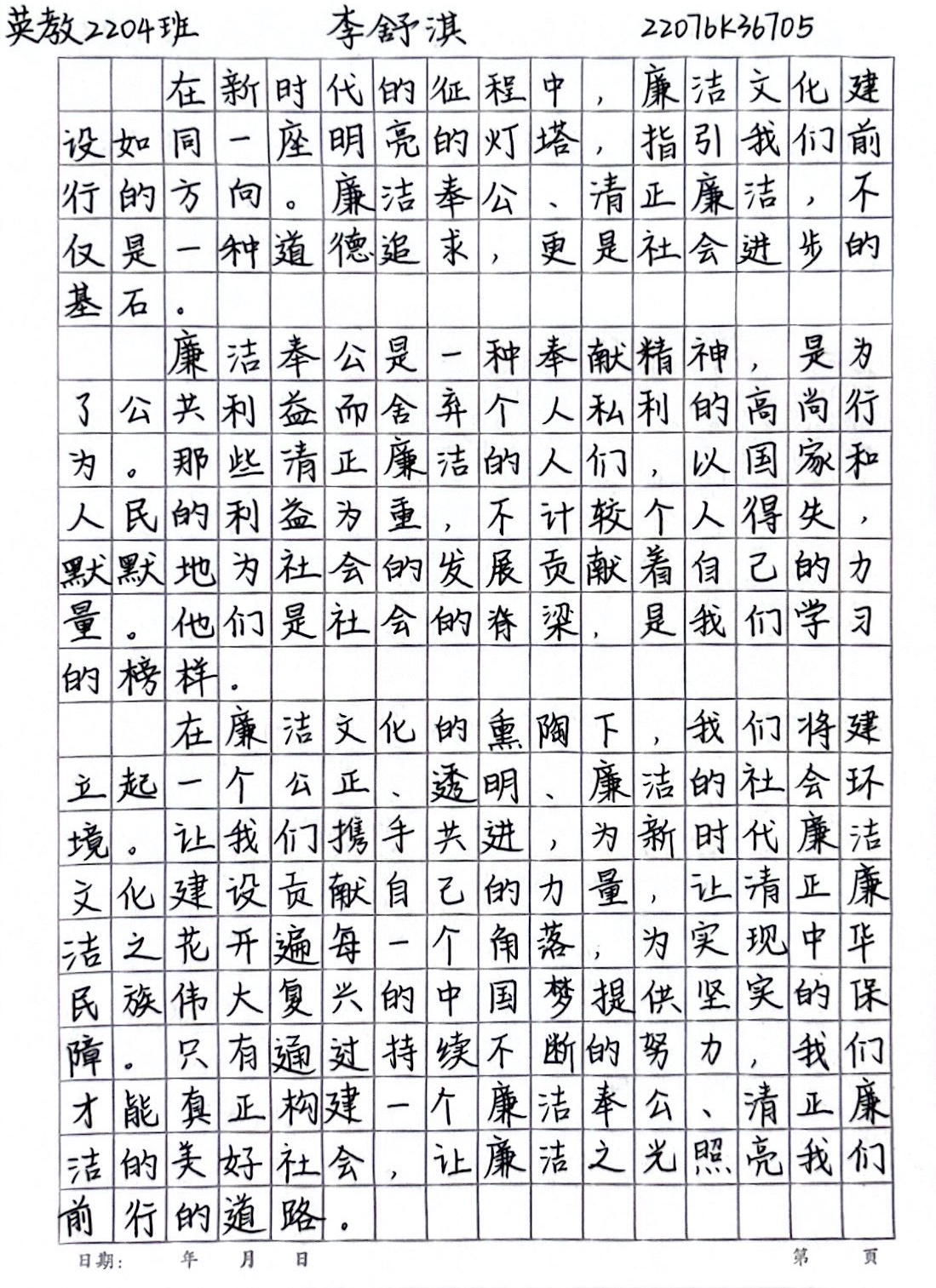 活动一经启动,我院2022级、2023级各班同学热情高涨,积极参与,满怀激情,挥毫泼墨,笔下生辉。同学们用笔尖在纸上写下体现廉洁奉公、清正廉洁内涵的古诗词、名人名言、党和国家领导人语录等表达对廉洁纪律文化道德的认同与赞扬。起笔、行云流水,顿笔、峰回路转,一幅幅书法作品跃然纸上。