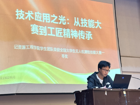 最后,全国第五届大学生无人机测绘技能竞赛一等奖获奖学生代表杨涛分享了参赛经验。他详细介绍了大赛概况、无人机测绘的学习与应用,以及测绘领域中的工匠精神。同时,他表示将继续发扬工匠精神,为测绘事业贡献力量。