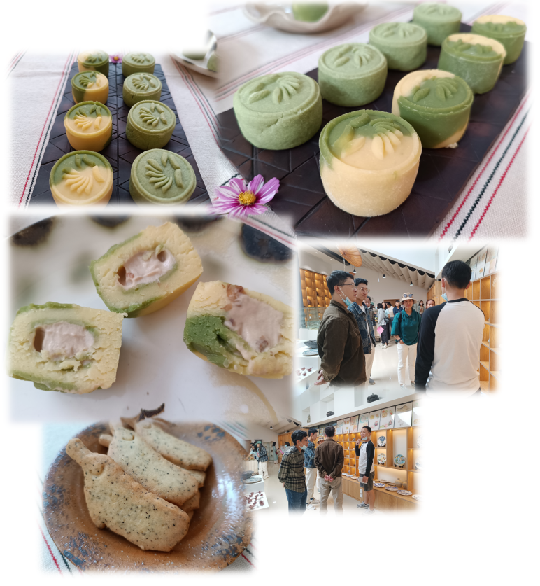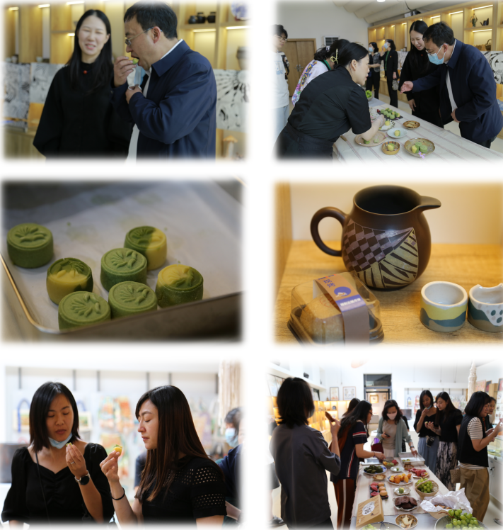 座谈会结束后,全体教师去到我院邓洁煌老师的陶瓷工艺大师工作室观看文创展览,并品尝了美味的茶点。值得一提的是当天所品尝的茶点,系邓洁煌老师和我校烹饪学院西点教师薛丽莎跨专业共同合作的作品——玫瑰绿豆糕。此款绿豆糕外形像月饼,饼面上印制着学校logo;脱壳绿豆沙做饼皮,里面分别包裹着香甜的玫瑰椰蓉和玫瑰流心,细腻滑润又不甜腻的口感获得了校领导和教师们的一致好评。