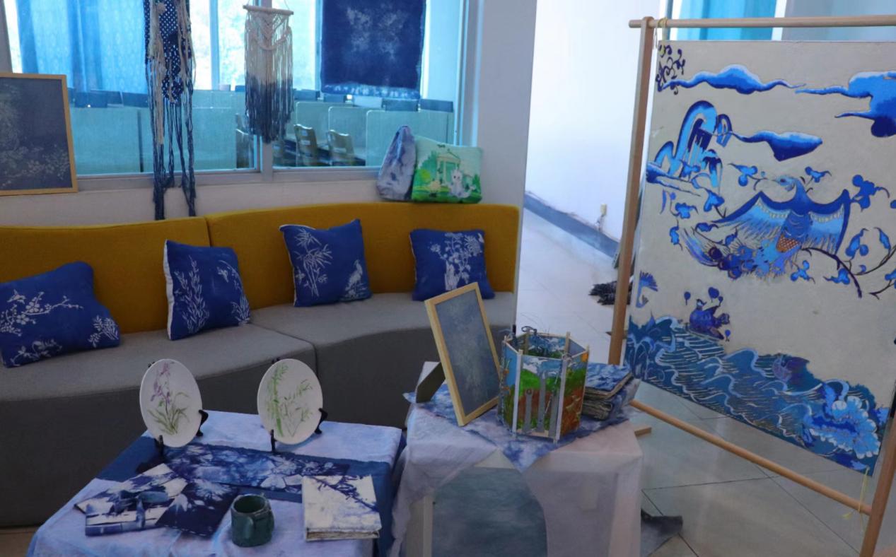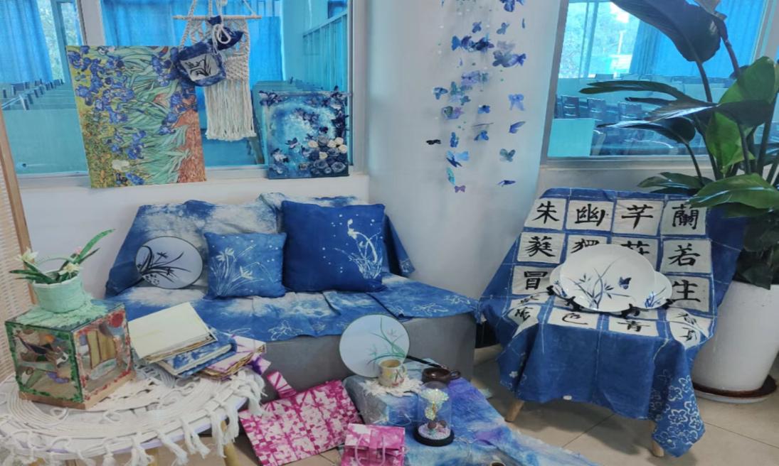 作品简介:本组作品以兰花为创作元素,运用蜡染、编织,陶瓷青花等工艺设计制作了兰花抱枕,兰花沙发布,牛皮纸包,玻璃灯,书法桌布(描述兰花的诗句),装饰画,蝴蝶风铃,青花瓷盘等系列作品,整体色系为蓝色系。