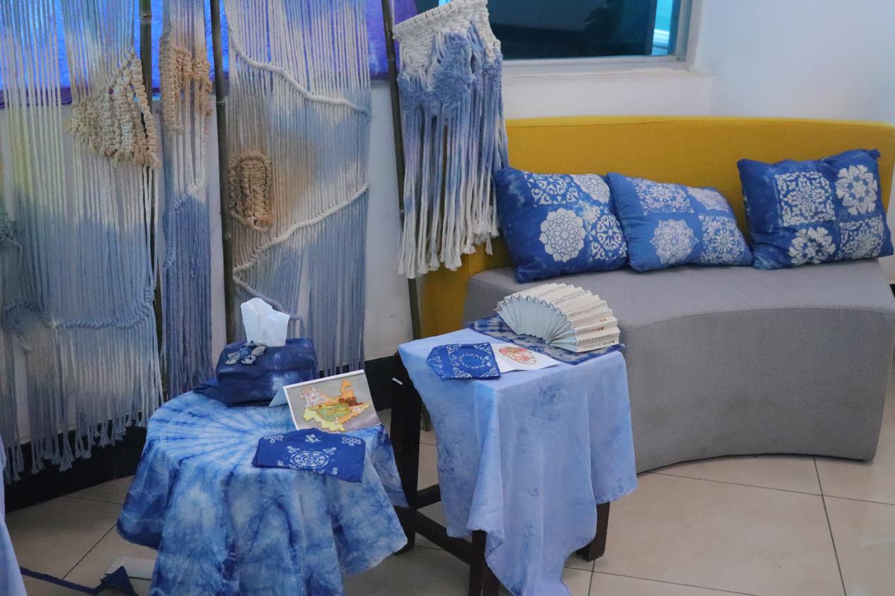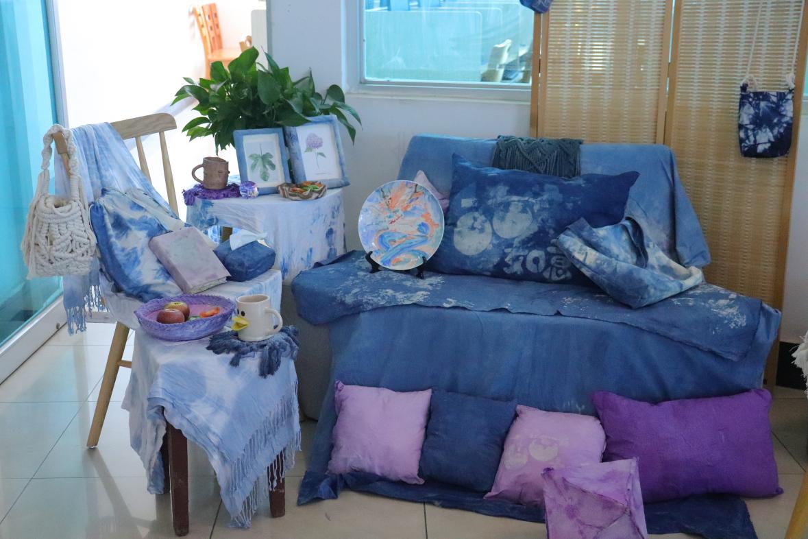 作品简介:本组运用扎染、陶艺、编织、扎染、蜡染和型糊染等多种工艺进行制作,营造家中阳台的休闲一刻,同时以蓝色为主旋律,紫色为点缀,想让人在阳台休闲做喜欢的事情时感到平静和安心又舒适。