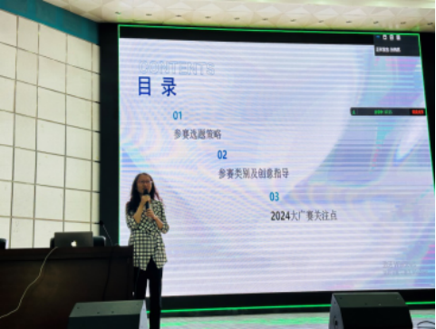 昌蕾副教授在讲座中从参赛选题策略、参赛类别及创意指导、2024大广赛关注点三个方面进行了详细讲解。