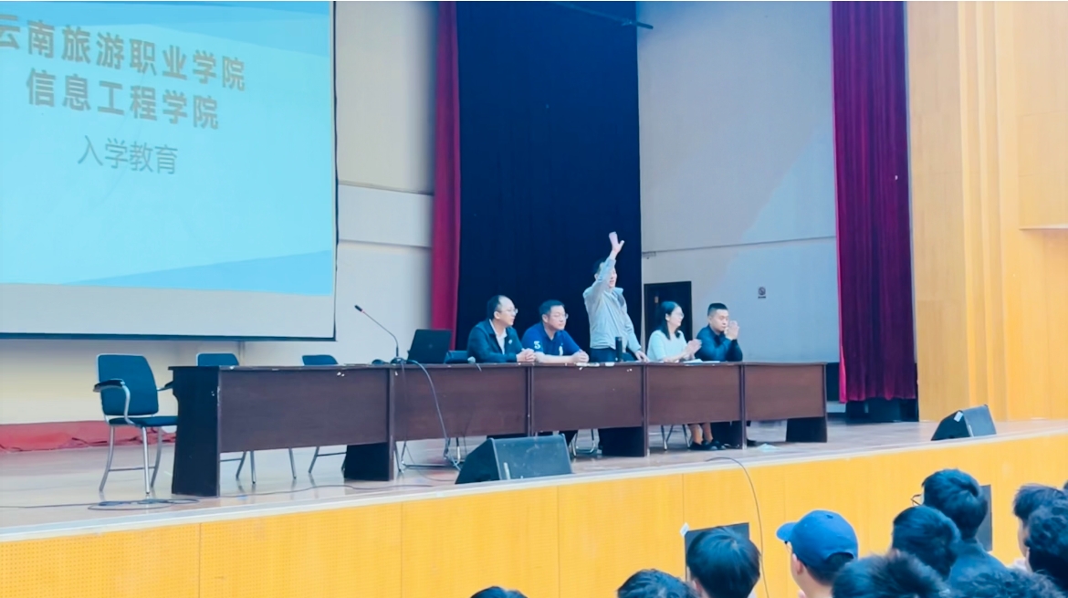信息工程学院党支部书记丁应逵,副书记段石林,副院长周健,团总支书记陈扬,专业课教师何俊丹、杨伟亮及2023级全体新生参加会议。