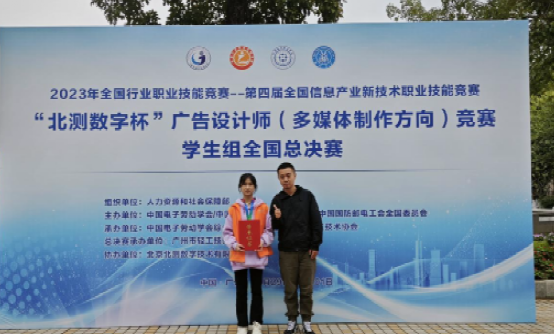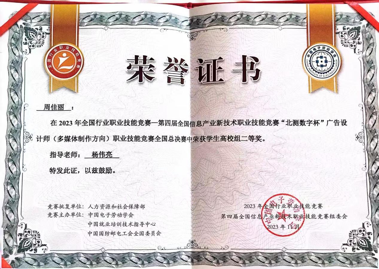 12月1日,信息工程学院学子参加第四届全国信息产业新技术职业技能竞赛“北测数字杯”广告设计师(多媒体制作方向)竞赛学生组全国总决赛在广州圆满结,经过激烈角逐,学院数字媒体技术专业的周佳丽同学获学生组个人二等奖的佳绩。