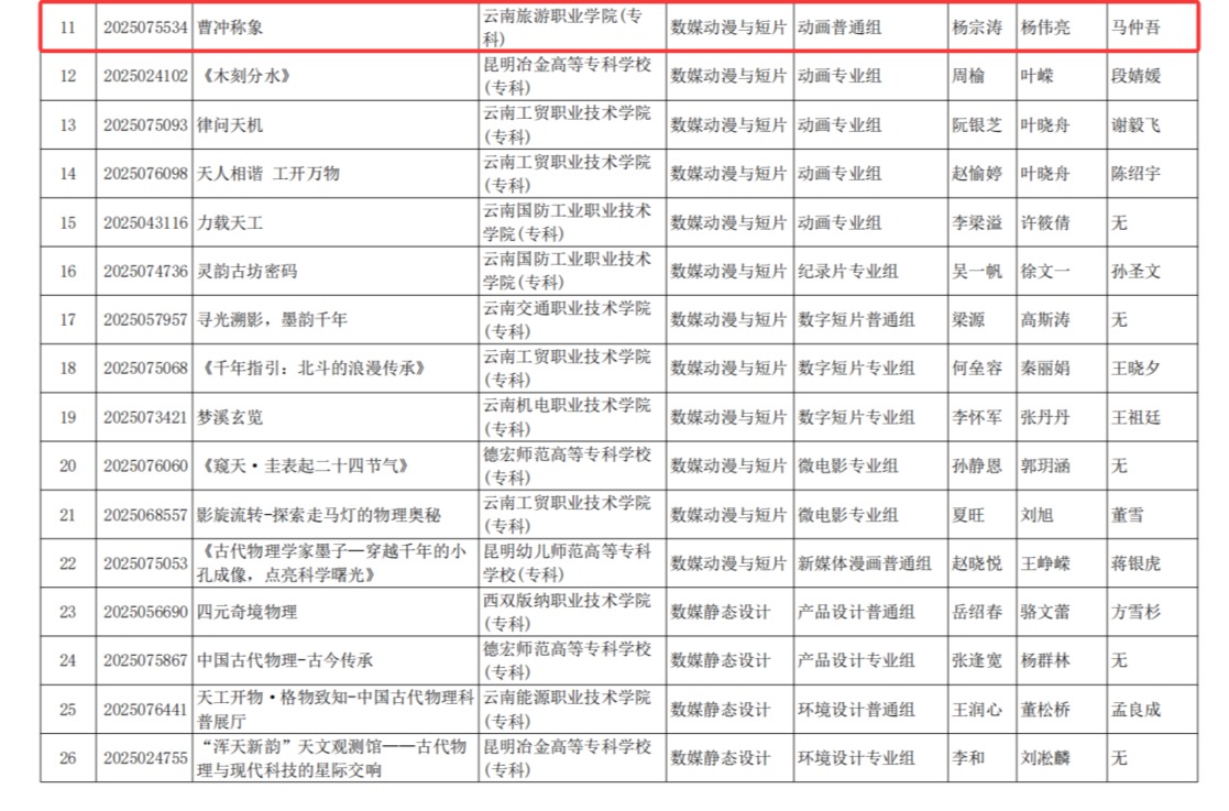 特别值得一提的是,由杨伟亮、马仲吾老师指导,软件技术2301班杨宗涛、彭旸、梁飞鹏、邱道森同学设计的作品《曹冲称象》,在"数媒动漫与短片"类动画普通组比赛中表现优异,成功晋级全国总决赛。